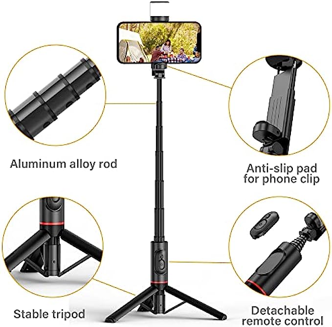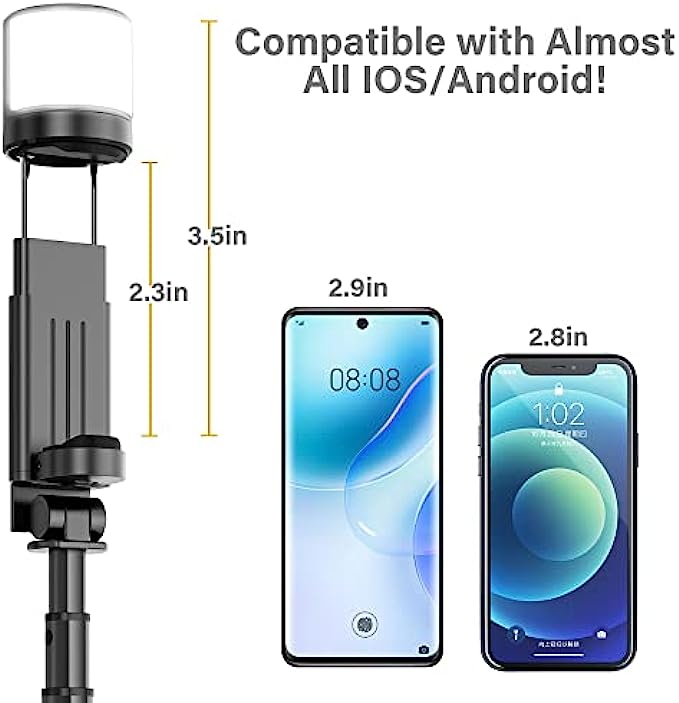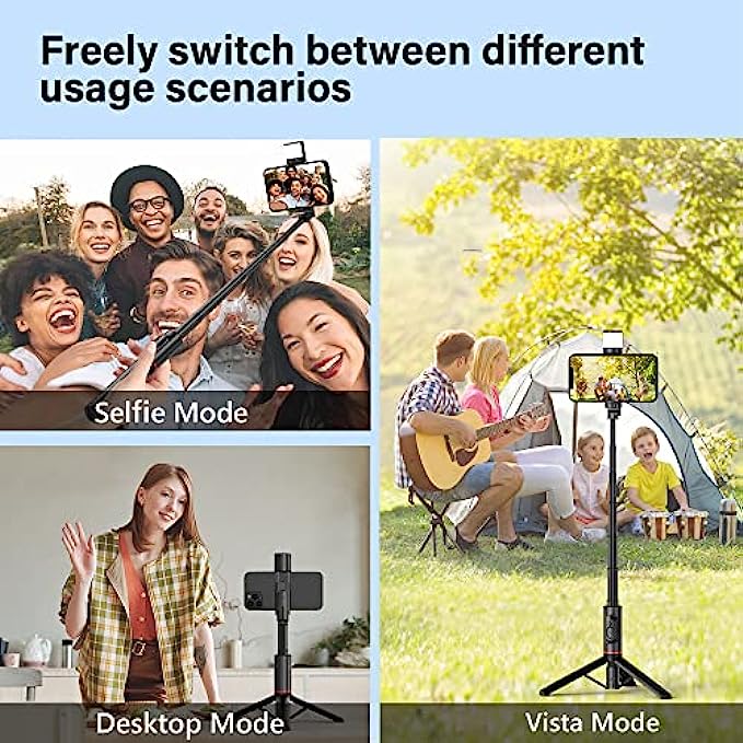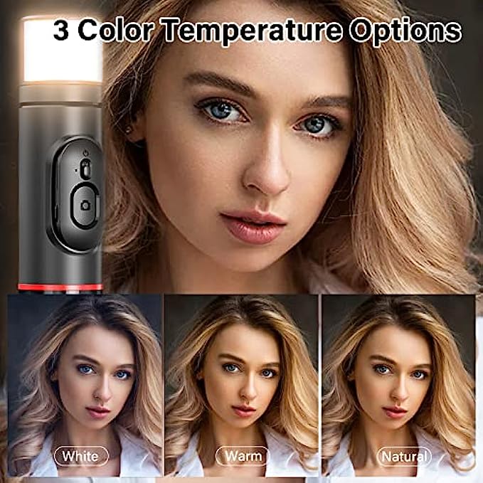 ?【Rechargeable And Rotatable LED Fill Light】This 2022 new-upgraded selfie stick tripod is equipped with a 360°Rotation LED Fill Light. 3 color temperature modes(white, natural, and warm) and each mode has 3 brightness levels, offering 9 options to help you take clear pictures in subdued lighting, then stand out. Perfect for selfies, vlogs, live streaming, group photos, etc.