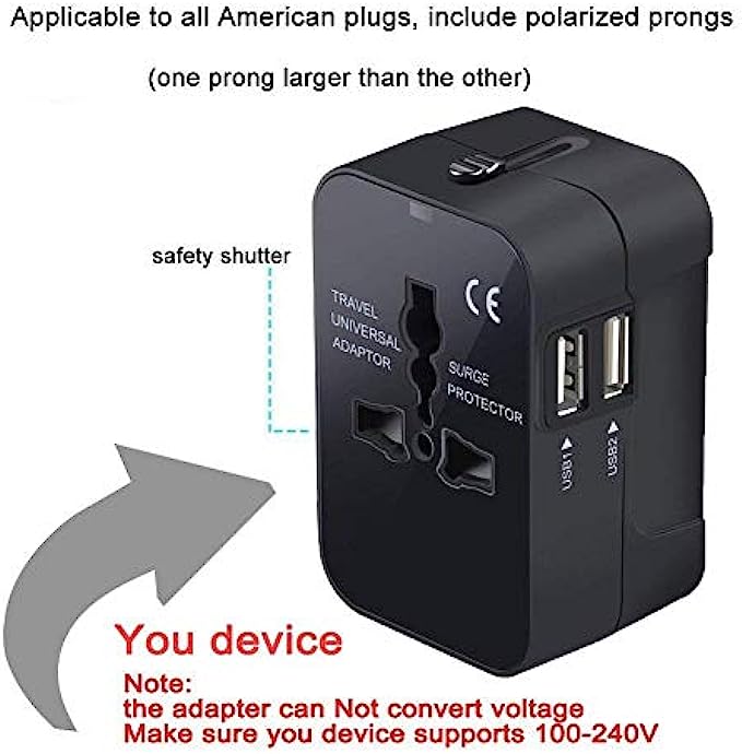 UNIVERSAL WORLDWIDE CHARGING - This travel adapter Accepts Plugs from More than 150 Countries with US/EU/UK/AU european Plugs like Thailand, New Zealand, Israel, Italy, Rome, France, Spain, Canada, China, Australia, India, Hong Kong, Argentina, Peru, Korea, Asia, etc SAFETY PROTECTION - this International Travel Power Adapter built-In safety shutters protect users from the direct touch of the live parts on the socket outlet All IN ONE - Detachable charger includes 5 Different Input Plugs Tightly Connect into 1 Adaptor DUAL USB CHARGING PORTS - World Adapter Plug compatible with almost all USB Devices like Apple iPhone x 8 8 plus 7 7s 6 6s 5s 4s, Sony, Blackberry, HTC, Lenovo, LG, ZTE, Huawei, and so on. SPECIFICATIONS - Power Rating 6A max. 100-240Vac (660W max. at 110Vac. 1380W max. at 230Vac) This Charger Adapter Plug Converts the Power Outlet Only, It Does Not Convert Electrical Output Current and Voltage. MIZO offers 24-Months limited product warranty and 24h*7d Customer Service from MIZO